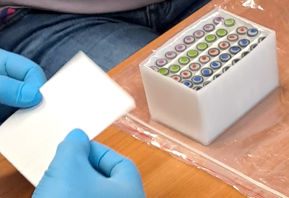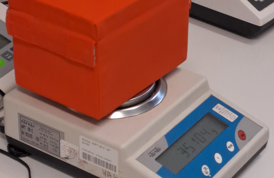 Zdjęcia ilustrujące przygotowanie hodowli zmodyfikowanych drożdży do podróży na ISS. Po lewej: buteleczki z pięcioma różnymi szczepami drożdży ciasno upakowane w pudełku z polipropylenu wydrukowanym w technice 3D. Po prawej: pomarańczowy pojemnik gotowy do lotu podczas sprawdzania jego wagi.